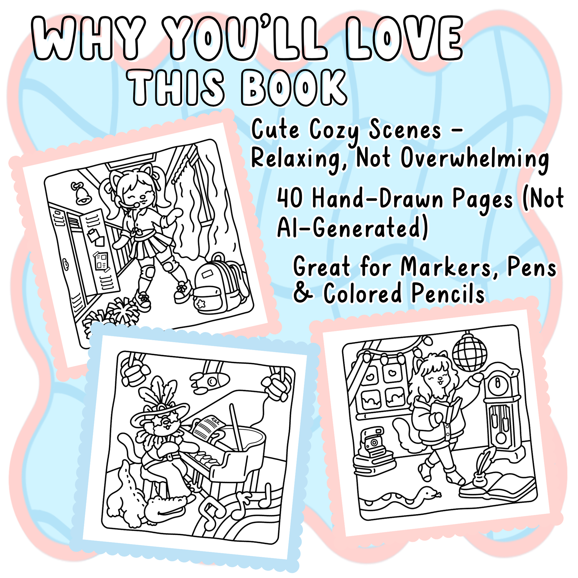 - 40 Unique, Hand-Drawn Designs + a coloring checklist, color test page, title page, & thank-you page